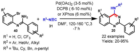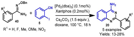 - Demakova, M.Y.; Islamova, R.; Suslonov, V. Palladium-Catalyzed Synthesis of 4-Aminoquinazolines from Amide Oxime Ethers and 2-Iodobenzonitrile. Russ. J. Gen. Chem. 2019, 89, 668–672. [Google Scholar] [CrossRef]