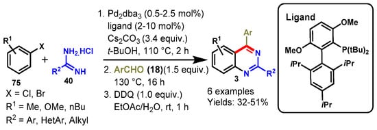- McGowan, M.A.; McAvoy, C.Z.; Buchwald, S.L. Palladium-catalyzed N-monoarylation of amidines and a one-pot synthesis of quinazoline derivatives. Org. Lett. 2012, 14, 3800–3803. [Google Scholar] [CrossRef] [PubMed]