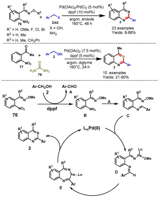 - Wang, H.; Chen, H.; Chen, Y.; Deng, G.-J. Palladium-catalyzed one pot 2-arylquinazoline formation via hydrogen-transfer strategy. Org. Biomol. Chem. 2014, 12, 7792–7799. [Google Scholar] [CrossRef] [PubMed]