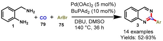 - Chen, J.; Natte, K.; Neumann, H.; Wu, X.-F. A convenient palladium-catalyzed carbonylative synthesis of quinazolines from 2-aminobenzylamine and aryl bromides. RSC Adv. 2014, 4, 56502–56505. [Google Scholar] [CrossRef]