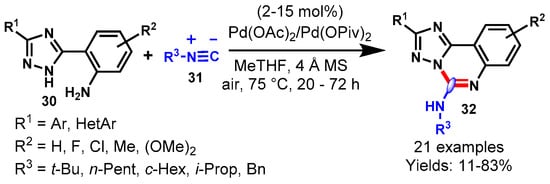 - Vlaar, T.; Bensch, L.; Kraakman, J.; Vande Velde, C.M.; Maes, B.U.; Orru, R.V.; Ruijter, E. Synthesis of Diverse Azolo [c] quinazolines by Palladium (II)-Catalyzed Aerobic Oxidative Insertion of Isocyanides. Adv. Synth. Catal. 2014, 356, 1205–1209. [Google Scholar] [CrossRef]