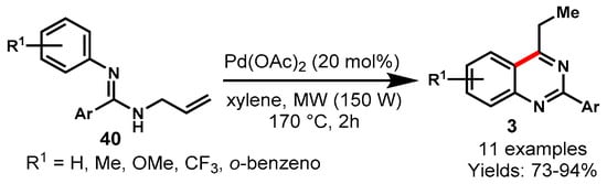- Xu, L.; Li, H.; Liao, Z.; Lou, K.; Xie, H.; Li, H.; Wang, W. Divergent synthesis of imidazoles and quinazolines via Pd (OAc) 2-catalyzed annulation of N-allylamidines. Org. Lett. 2015, 17, 3434–3437. [Google Scholar] [CrossRef] [PubMed]