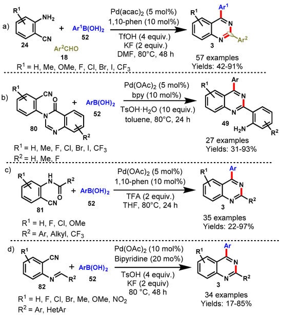 - Zhang, Y.; Shao, Y.; Gong, J.; Hu, K.; Cheng, T.; Chen, J. Palladium-Catalyzed Tandem Reaction of Quinazolinone-Based Nitriles with Arylboronic Acids: Synthesis of 2-(4-Arylquinazolin-2-yl) anilines. Adv. Synth. Catal. 2018, 360, 3260–3265. [Google Scholar] [CrossRef]