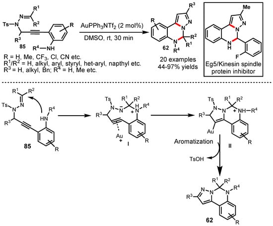 - Tang, H.-T.; Xiong, K.; Li, R.-H.; Ding, Z.-C.; Zhan, Z.-P. Synthesis of 5,6-Dihydropyrazolo [1,5-c] quinazolines through Gold-Catalyzed Chemoselective Bicyclization of N-Propargylic Sulfonylhydrazones. Org. Lett. 2015, 17, 326–329. [Google Scholar] [CrossRef] [PubMed]