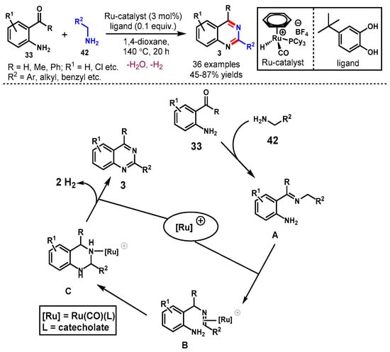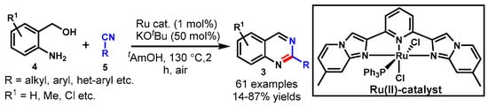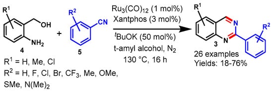 - Chen, M.; Zhang, M.; Xiong, B.; Tan, Z.; Lv, W.; Jiang, H. A novel ruthenium-catalyzed dehydrogenative synthesis of 2-arylquinazolines from 2-aminoaryl methanols and benzonitriles. Org. Lett. 2014, 16, 6028–6031. [Google Scholar] [CrossRef] [PubMed]