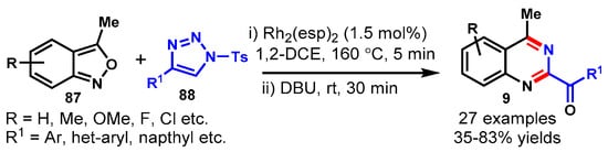 - Lei, X.; Gao, M.; Tang, Y. Rh (II)-catalyzed transannulation of N-sulfonyl-1,2,3-triazoles with 2,1-benzisoxazoles or 1,2-benzisoxazoles. Org. Lett. 2016, 18, 4990–4993. [Google Scholar] [CrossRef] [PubMed]