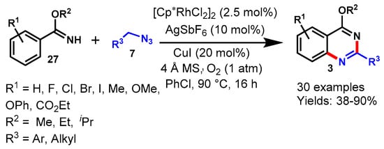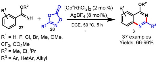- Wang, J.; Zha, S.; Chen, K.; Zhang, F.; Song, C.; Zhu, J. Quinazoline Synthesis via Rh(III)-Catalyzed Intermolecular C–H Functionalization of Benzimidates with Dioxazolones. Org. Lett. 2016, 18, 2062–2065. [Google Scholar] [CrossRef]