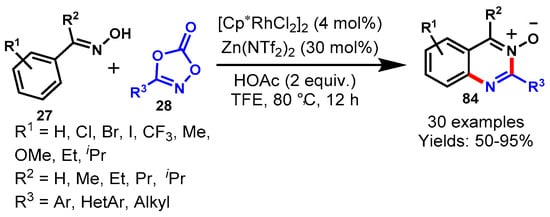 - Wang, Q.; Wang, F.; Yang, X.; Zhou, X.; Li, X. Rh (III)-and Zn (II)-Catalyzed Synthesis of Quinazoline N-Oxides via C–H Amidation–Cyclization of Oximes. Org. Lett. 2016, 18, 6144–6147. [Google Scholar] [CrossRef] [PubMed]