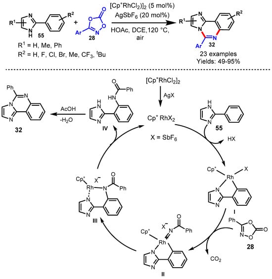 - Wu, X.; Sun, S.; Xu, S.; Cheng, J. Rh-Catalyzed Annulation of ortho-C−H Bonds of 2-Arylimidazoles with 1,4,2-Dioxazol-5-ones toward 5-Arylimidazo [1,2-c] quinazolines. Adv. Synth. Catal. 2018, 360, 1111–1115. [Google Scholar] [CrossRef]