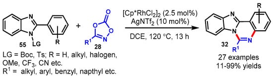 - Xu, L.; Li, T.; Wang, L.; Cui, X. Rh (III)-Catalyzed One-Pot Synthesis of Benzimidazoquinazolines via C–H Amidation–Cyclization of N-LG-2-phenylbenzoimidazoles. J. Org. Chem. 2018, 84, 560–567. [Google Scholar] [CrossRef]
