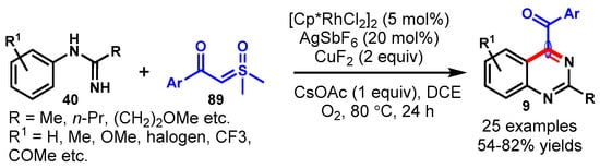 - Lai, R.; Wu, X.; Lv, S.; Zhang, C.; He, M.; Chen, Y.; Wang, Q.; Hai, L.; Wu, Y. Synthesis of indoles and quinazolines via additive-controlled selective C–H activation/annulation of N-arylamidines and sulfoxonium ylides. Chem. Commun. 2019, 55, 4039–4042. [Google Scholar] [CrossRef] [PubMed]