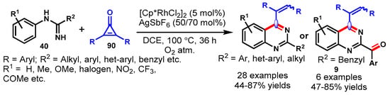 - Xing, H.; Chen, J.; Shi, Y.; Huang, T.; Hai, L.; Wu, Y. Synthesis of 4-ethenyl quinazolines via rhodium (iii)-catalyzed [5 + 1] annulation reaction of N-arylamidines with cyclopropenones. Org. Chem. Front. 2020, 7, 672–677. [Google Scholar] [CrossRef]