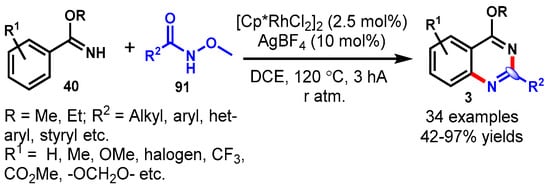- Xu, H.-B.; Zhu, Y.-Y.; Yang, J.-H.; Chai, X.-Y.; Dong, L. Rh III-Catalyzed one-pot cascade synthesis of quinazolines with N-alkoxyamide as an amidating reagent. Org. Chem. Front. 2020, 7, 1230–1234. [Google Scholar] [CrossRef]