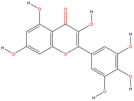 Many compounds with diverse structures, such as phenothiazines [10,11,12], quinolones [13,14], quinolinyl pyrimidines [15,16], 2-mercapto-quinazolinones [17], and tricyclic spiroLactams [18], have been identified as potent antibacterial agents targeting NDH-2 in Mycobacterium tuberculosis. However, there is limited information available on inhibitors that target S. aureus NDH-2. Currently, only 2-heptyl-4-hydroxyquinoline-N-oxide (HQNO) and three phenothiazine compounds (thioridazine, trifluoperazine, and chlorpromazine) have been characterized as inhibitors of S. aureus NDH-2 in vitro [8,19]. Recent screening efforts of natural compounds derived from plants have unveiled myricetin, a 3, 3′, 4′, 5, 5′, 7-hexahydroxy flavone (Figure 1), as a more potent in vitro inhibitor of S. aureus NDH-2 compared to HQNO. This discovery prompted our investigation into the inhibitory properties of myricetin against NDH-2. Therefore, this study aims to explore the inhibitory effect and mechanism of myricetin on NDH-2, as well as its impact on the growth and virulence factor expression in S. aureus.