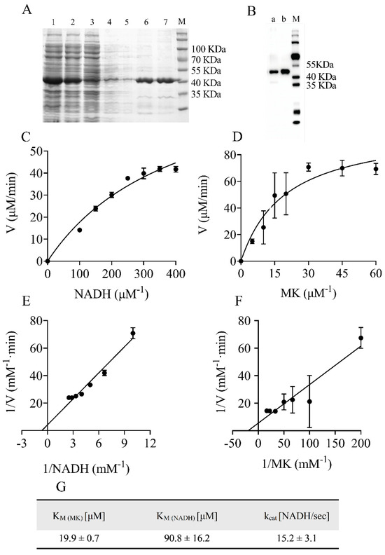 Preparation and enzymatic properties of heterologously expressed NDH−2. (A) SDS−PAGE of purified protein. 1: Lysate, 2: Supernatant, 3: Pellet, 4: Wash, 5: 30 mM imidazole, 6: 80 mM imidazole, 7: 150 mM imidazole. (B) Western blotting of NDH−2 using anti−6His−tag antibody. a: 80 mM imidazole, b: 150 mM imidazole, M: Protein Marker. (C,D) The plot of the reaction rate (V) vs. substrate concentration. (E,F) The kinetic parameters Km were calculated by Lineweaver−Burk plot of 1/V vs. 1/S. (G) The turnover number (kcat) and affinity (Km) for the substrates of the enzyme were determined. Data are expressed as mean ± SD of three independent experiments.