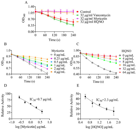 We used 96-well plates to conduct the screens with a reaction mixture consisting of 2.5 μg/mL purified NDH-2 and various drugs at a concentration of 32 μg/mL. To validate the screenings, enzyme inhibition assays were performed with 3.2% DMSO (negative control) and HQNO, a well-known NDH-2 inhibitor (positive control) [22]. As shown in Figure 3A, 32 μg/mL HQNO almost completely inhibited the NADH oxidation catalyzed by NDH-2. Similar results were observed for myricetin. To determine the half maximal inhibitory concentration (IC50) of myricetin, different concentrations of drugs were added into the assay mixture, and the reaction was monitored via absorbance at 340 nm (Figure 3B,C). Probit analysis was performed on the data to obtain probability of response curves (Figure 3D,E). The calculated IC50 of myricetin was found to be 0.7 μg/mL (2 μM), which was about 4.5 times lower than that of the positive agent HQNO (2.3 μg/mL or 9 μM).