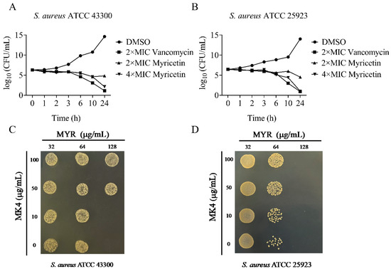 The antimicrobial activity of myricetin against Staphylococcus aureus. (A,B) Time–kill curves for Staphylococcus aureus treated with myricetin. The concentrations are as follows: ●, 3.2% DMSO; ▴, 2 × MIC of myricetin; ▾, 4 × MIC of myricetin; ■, 2 × MIC of vancomycin. (C,D) MK4 antagonizes the antibacterial activity of myricetin.