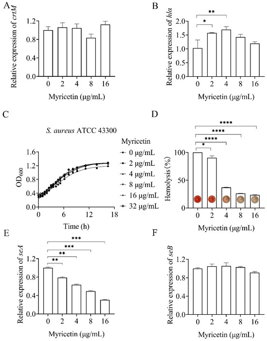 In addition, the impact of myricetin on the gene expression of staphylococcal enterotoxins (SEA and SEB) was investigated using qRT-PCR. As depicted in Figure 6E, myricetin inhibited the expression of seA in a dose-dependent manner within the concentration range of 2–16 μg/mL. Conversely, only minor or non-significant effects of the compounds on seB expression were observed (Figure 6F).