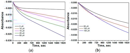 BChE-catalyzed hydrolysis kinetics of Mirabegron in 0.1 M phosphate buffer pH 7.0 at 25 °C: (a) from 5 to 65 μM Mirabegron; (b) from 85 to 150 μM Mirabegron. The change in absorbance was monitored at 247 nm.