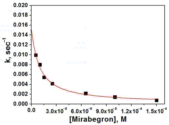 Dependence of the first-order induction rate constant (kobs) on the Mirabegron concentration. Data fitted to Equation (6) (r2 = 0.99).
