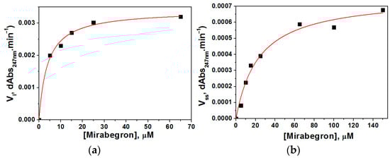 Dependence of initial (vi) and steady-state (vss) rates on the Mirabegron concentration in 0.1 M phosphate, pH 7.0, at 25 °C: (a) form E; (b) form E′. Data fitted to Equation (1): (a) r2 = 0.99; (b) r2 = 0.98.