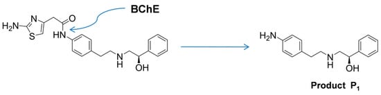 Only one AAA drug, the substrate of BChE, has been used in human medicine for its pharmacological properties so far [3]. Racemic Mirabegron (CAS number 223673-61-8;2-amino-N-[4-[2-[[(2R)-2-hydroxy-2-phenylethyl]amino]ethyl]phenyl]-4-thiazoleacetamide) (Figure 1), also marketed as MYRBETRIQ, BETANIS and BETMIGA, is a β3-adrenergic agonist initially used for the treatment of an overactive bladder (OAB) [6]. However, this drug has several other potential uses, for example, as an anti-obesity drug [7], and—as a consequence of browning adipose tissues—an anticancer agent [8]. Thus, given the renewed interest in this drug, it is important to revisit its metabolism, in particular the mechanism of its hydrolytic inactivation in blood circulation.