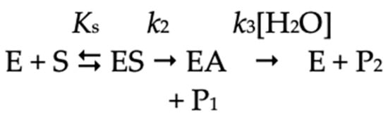 In the case of AAA substrates, where acylation (k2) is the rate-limiting step (k2 << k3), the catalytic constant (kcat) is equal to the acylation constant k2 and Km = Ks, the dissociation of the enzyme–substrate complex ES [4,5]. Then, the bimolecular rate constant of the reaction, kcat/Km, is: