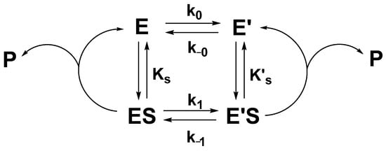 According to this model, the two active forms of the enzyme, E and E′, in slow equilibrium differ in their binding properties (Ks and K′s, the dissociation constant of ES and ES′ complexes) and catalytic activity (kcat and k′cat of both forms). Then, the dependence of kobs on [S] can be described by the Frieden general equation (Equation (6)) corresponding to the model in Scheme 2: