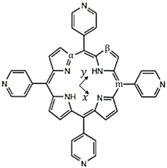Schematic representation of free-base tetrapyridyl porphyrin (H2TPyP). Within the macrocycle’s plane, two distinct directions are defined: (i) the x-direction containing only nitrogen atoms, and (ii) the y-direction containing nitrogen atoms bonded with hydrogen. The indices and give the carbon positions in the pyrrolic rings, and indicates the carbon position in the methynic bridge. The carbon atoms occupying these positions are labeled as follows: , linked to the central nitrogen atoms; , located at the outer edge of the macrocycle; and (meso-carbon), connecting the pyrrolic rings.