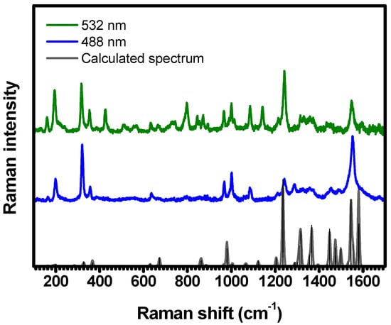 Within the spectral range of , no Raman bands were detected in the spectrum at , as shown in Figure 4. Nevertheless, at , three distinct Raman bands emerge at , , and , indicating the resonance of these modes with electronic transition. The observed Raman bands are assigned to the vibrations at , at , and at in the calculated spectrum, respectively; see Table 1 and Table S2 in SI (illustrations 7–9).