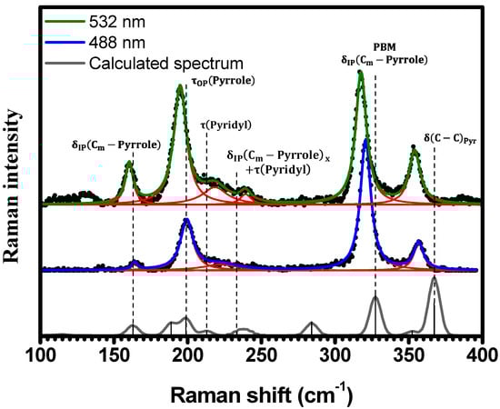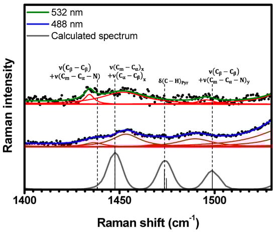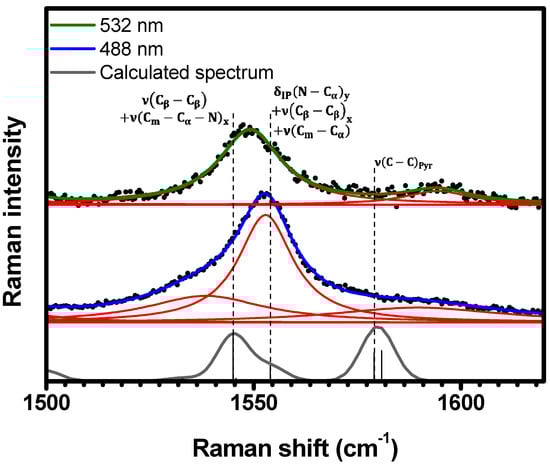 Figure 5 presents the Raman spectra within the range of . Several Raman bands are resonant when porphyrins are excited under (, , , , , , and ), whereas the spectrum obtained with excitation exhibits only one Raman band at (corresponding to at ). According to DFT calculations (see Table 1 and Table S2 in SI (illustrations 10–16)), these Raman bands are assigned to the following vibrations: at , at , at , at , at , at , and at .