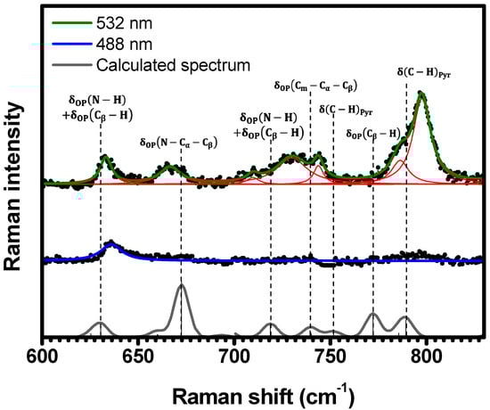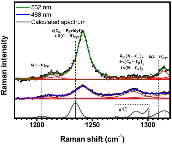 Experimental Raman spectra (top and middle) measured for C-H2TPyP (black dots) and calculated (bottom) for the H2TPyP molecule (gray solid line) under ambient conditions in the spectral range of . The experimental spectra were obtained by exciting the sample at 488 nm (middle spectrum) and 532 nm (top spectrum). The blue (488 nm) and green (532 nm) solid curves represent the fittings obtained through the deconvolution process using Lorentzian functions (red solid lines). In the theoretical spectrum, Raman intensity (in A4/amu) refers to the Raman activity (scattering factor).
