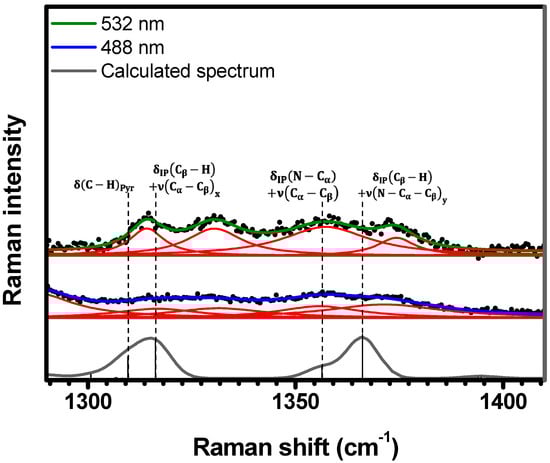 These spectra were acquired by exciting the sample at (resonant with the absorption band), and at (resonant with the intersection between the and bands, referred to herein as the band) [20]. These vibronic progressions arise from the coupling of the electronic absorption band with the vibrational modes centered around ( band) [20]. To provide a clearer depiction of the investigated modes, we present and discuss the results by zooming into the specific spectral regions, as depicted in Figure 3, Figure 4, Figure 5, Figure 6, Figure 7, Figure 8, Figure 9, Figure 10 and Figure 11. The experimental spectra were deconvoluted using Lorentzian functions. This constitutes a conventional approach in Raman spectroscopy, stemming from the intrinsic properties of Raman scattering (RS). The semi-classical interpretation of RS relies on the forced damped oscillator model, which follows the Lorentzian function. In the quantum mechanical framework, each vibration exhibits a Lorentzian probability of light scattering [34]. The fitting procedure enables us to identify the spectral band positions with a deviation of . The corresponding center-peak wavenumbers () of the Raman bands, obtained with and , are listed in Table 1. Illustrations with an overview of the identified vibration patterns are provided in Table S2 in Supplementary Materials.