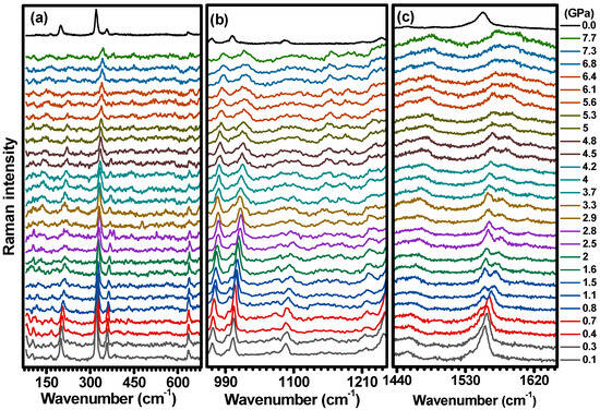 Evolutions of the frequencies of the Raman bands with increasing pressure. The evolution of the Raman bands with pressure is analyzed for three distinct wavenumber regions: (a) , (b) , and (c) , to facilitate a more comprehensive discussion.