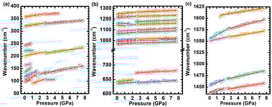 Figure 13 shows the evolution of the Raman band frequencies with increasing pressure, presenting distinct rates , as summarized in Table 2. Notably, at pressures of , , , and , changes in the wavenumber displacement are evident for some Raman bands, as indicated in Table 2.