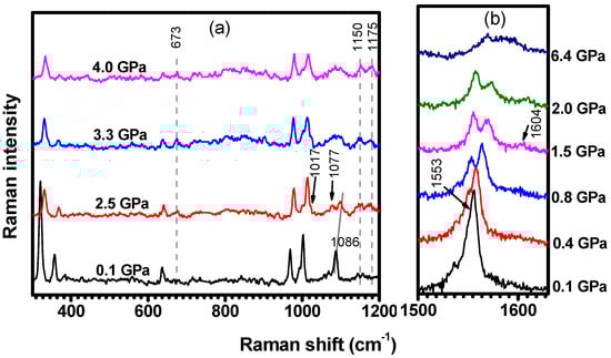 Raman spectra ranging from (a) to , and (b) from to . The spectra were excited at and acquired under different hydrostatic pressures.