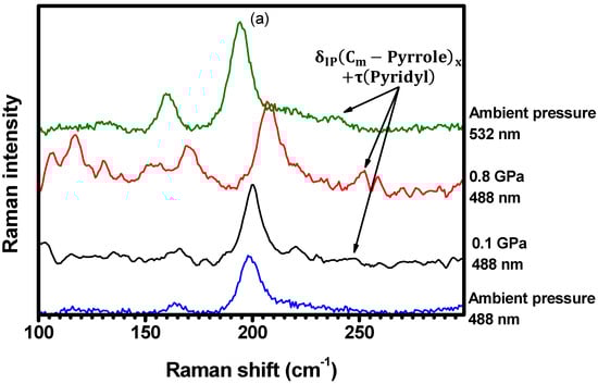 To explore the structural stability of C-H2TPyP, studies were conducted under high-pressure conditions, from to . In Figure 12, the Raman spectra acquired from samples under ambient conditions and submitted to various loads are presented. To facilitate a more comprehensive discussion, the Raman spectra are divided into three distinct wavenumber regions: , , and . It is worth noting that even at a very low pressure (), some modes that were not visible under ambient conditions become apparent. The lack of theoretical prediction for some of these modes as vibrational modes of the H2TPyP molecule suggests that the bands in the low-wavenumber region () are associated with the lattice vibration of C-H2TpyP, i.e., librations and the torsion of porphyrin’s ring.