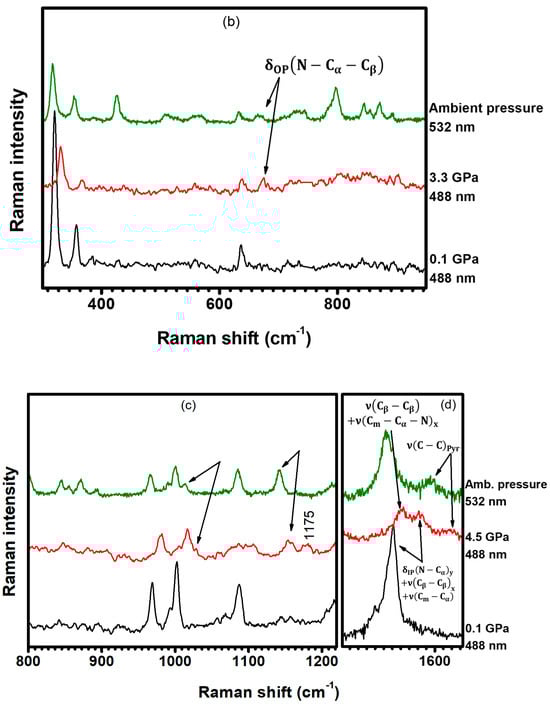Raman spectra ranging from (a) to , (b) to , (c) to , and (d) from to . The spectra were acquired under different hydrostatic pressures and excited at both and (ambient conditions).