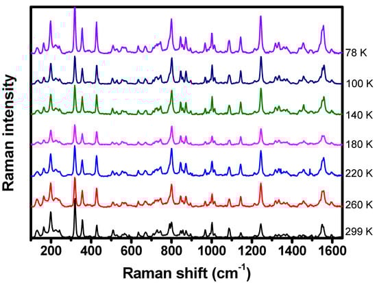 The analysis of the relative intensities of the Raman bands with respect to the PBM ( intensity at 299 shows that the intensities of most of the Raman modes remain essentially unchanged. However, some vibrations have their intensities greatly altered at lower temperatures, such as the vibration at , whose relative intensity has an initial value of at room temperature (299 ) that is increased to at (see Figure 18a), and the mode at , whose relative intensity goes from to when the temperature is lowered from 299 to 180 ; see Figure 18b.
