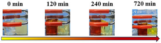 Color change of polymerization solutions at different reaction time: left is copolymerization of My and AMS; right is homopolymerization of My.