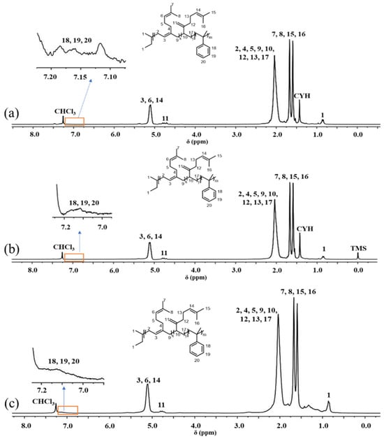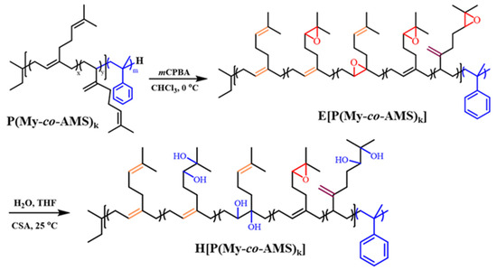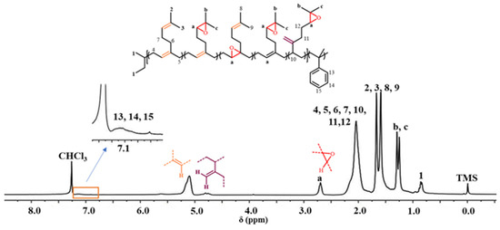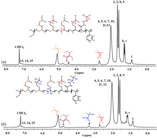 The synthetic routes for epoxidation and hydroxylation reactions are shown in Scheme 2. First, the polymer was reacted with meta-chloroperoxybenzoic acid (mCPBA) ([mCPBA]/[C=C] = 0.30) in chloroform at 0 °C for 1 h to obtain a quantitatively epoxidized P(My-co-AMS)3. The 1H NMR spectrum of the product is shown in Figure 6. The attribution of some of the proton peaks can be found in the spectrum as follows: δ = 0.66–0.87 (1, CH3CH2-, CH3CH-), δ = 2.02 (-CHCH2C-, -CCH2CH2-, -CH2CHCH2), δ = 1.66, 1.58 (2, 3, 8, 9, -C(CH3)2), δ = 4.66–4.80 (-CCH2), δ = 5.10 (-CCH-), δ = 7.00–7.20 (13, 14, 15, -CHC6H5-). In addition to the same characteristic peaks as previously described for P(My-co-AMS)3, the characteristic peaks of two methyl (b, c) protons in the epoxide group were observed at δ = 1.25 and 1.29, respectively, and the characteristic peak of a hypromethyl proton in the epoxide group (a) was found at δ = 2.69 [41]. The presence of these two characteristic peaks can prove that part of the double bond in the polymer chain was successfully converted into epoxy group, indicating the successful epoxidation reaction. The epoxidation degree of about 20–30% can be calculated from the integral area ratios of the three peaks at δ = 2.69, 4.66–4.80 and 5.10.