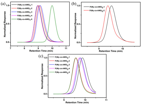 GPC traces of P(My-co-AMS)k copolymers: (a) P(My-co-AMS)1; (b) P(My-co-AMS)2; (c) P(My-co-AMS)3.
