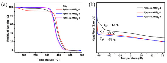 (a) TGA thermograms and (b) DSC thermograms of P(My-co-AMS)k.