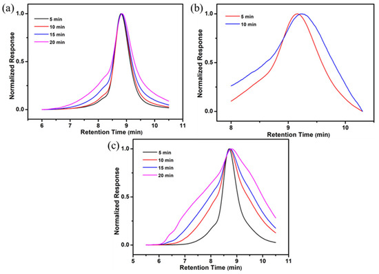 In this study, a simple heating degradation experiment under reduced pressure was carried out on PMy homopolymer and linear copolymers, where the polymers were placed under vacuum and heated (250 °C) for different times and then sampled at different times for GPC test to observe the molecular weight changes. The GPC curves of the samples after heating the PMy homopolymer for different times are shown in Figure 5a, from which it can be seen that PMy has a better stability after heating, and the main peak is basically not changed. However, with the increasing heating time, the proportion of the insoluble part of the sample increased, while the GPC curve measured for the soluble part became wider. After doping a small number of PAMS units in the PMy backbone, the linear copolymer P(My-co-AMS)1 was heated, and the GPC curves of the products after heating for different times are shown in Figure 5b. It can be observed from the figure that unlike PMy homopolymer, the PAMS fragments in P(My-co-AMS)1 have undergone thermal degradation, which resulted in very broad peaks on the GPC curves after heating. Moreover, the linear copolymer P(My-co-AMS)2 with two block numbers was also heated and the GPC curves of samples after heating for different times are shown in Figure 5c. It can be also observed that a very broad peak occurred on the GPC curves after heating due to the presence of PAMS.