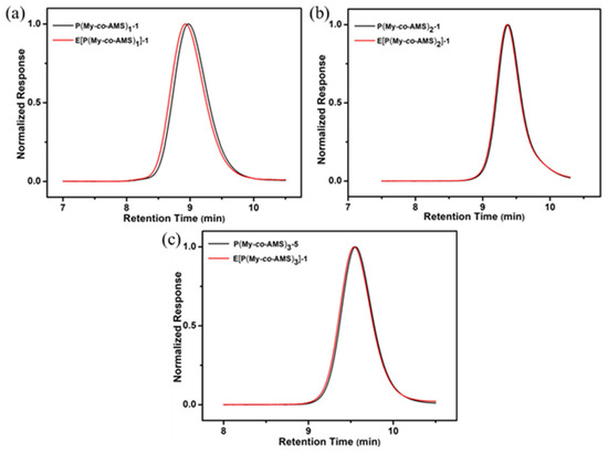 GPC was used to characterize the molecular weights and molecular weight distributions of E[P(My-co-AMS)k], the GPC curves are shown in Figure 7 and the relevant data are summarized in Table 3. It can be seen from Figure 7 that all the GPC curves are single-peak distributions with low molecular weight distributions (Ð = 1.05–1.15). Moreover, the Ð values of the epoxidation products were not broadened compared to their corresponding precursor polymers, and no shoulder peaks were observed. Finally, from the molecular weight point of view, it was found that the molecular weight of the epoxidation product increased slightly, which was consistent with the epoxidation results. Combined with the result of 1H NMR spectrum, it can be proved that the epoxidation reaction was successfully carried out and the epoxidized copolymer can be used in the next step of the reaction.