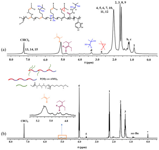 In the present study, as a demonstration, the hydroxylation reaction of E[P(My-co-AMS)3] was also carried out by the same method [41]. The 1H NMR spectra of H[P(My-co-AMS)3] and its precursor are shown in Figure 8, from which it can be clearly seen that the characteristic peak attributed to the epoxy group proton at δ = 2.69 was significantly weakened. A characteristic peak belonging to the proton on the carbon attached to the hydroxyl group appeared at δ = 3.3 ppm. The rest of the characteristic peaks are consistent with those described in the previous section, demonstrating the successful synthesis of hydroxylated product.