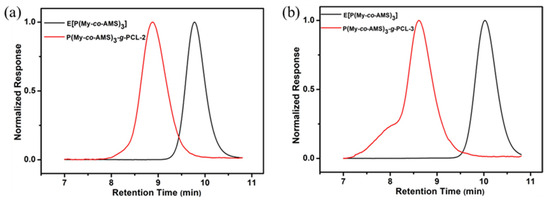 GPC traces of graft copolymers and their precursors: (a) P(My-co-AMS)3-g-PCL-2; (b) P(My-co-AMS)3-g-PCL-3.