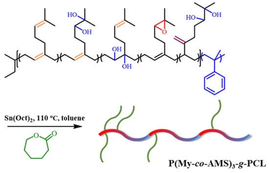 The synthetic route of P(My-co-AMS)3-g-PCL graft copolymer is shown in Scheme 3. Li et al. performed the ring-opening polymerization (ROP) of ε-CL at room temperature using side hydroxyl groups on the main chain of hydroxylated polybutadiene as initiator and TBD as catalyst [42]. However, in this experiment, TBD failed to initiate the ROP of ε-CL at room temperature. Instead, we used stannous octanoate as the catalyst and conducted the ROP reaction at 90 °C, 100 °C, and 110 °C, respectively. The reaction was successfully performed at 110 °C.