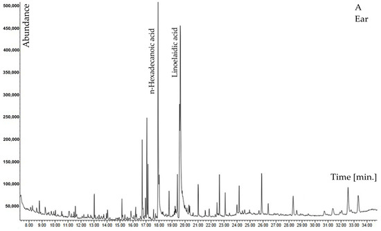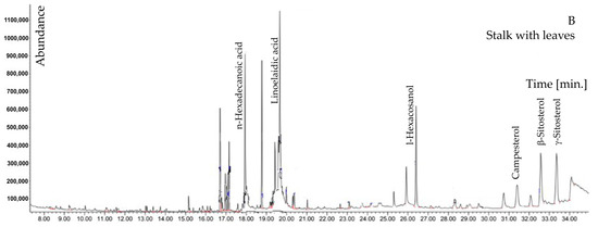 GC–MS chromatogram of methanolic extract of Hordeum murinum L. subsp. murinum: (A)—ears, (B)—stalk with leaves.