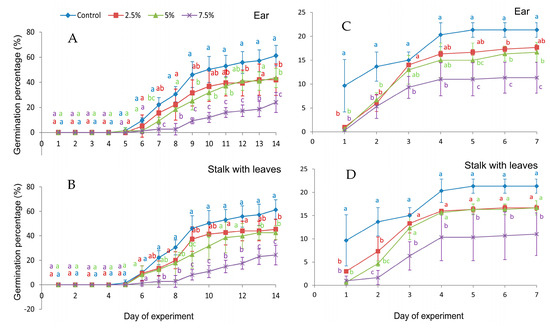 Germination percentage of seeds of Festuca rubra L. (A,B) and Trifolium repens L. cv. Grassland Huia (C,D), watered with extracts from the organs of Hordeum murinum L. subsp. murinum, with different percentage concentrations (2.5%, 5%, 7.5%). (A,C)—aqueous extracts from ears, (B,D)—aqueous extracts from stalks with leaves; mean values were calculated from 3 replicates (±SD); means marked with different letters differed significantly according to Duncan’s test p ≤ 0.05.